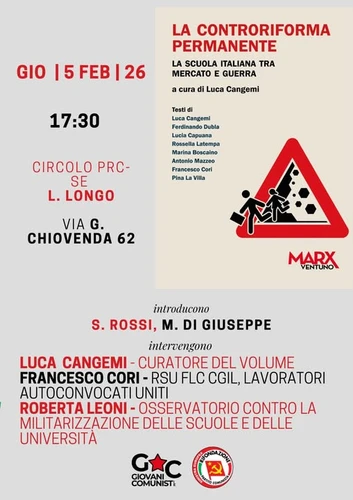 Osservatorio contro militarizzazione di scuole e università - Wednesday, February 4, 2026Domani, 5 febbraio, nel Circolo del Partito della Rifondazione Comunista verrà presentato il testo collettaneo La controriforma permanente. La scuola italiana tra mercato e guerra, curato da Luca Cangemi, ex deputato di PRC, ora fra i fondatori del Partito Comunista, a cui si devono la bella introduzione e la scelta degli interventi.