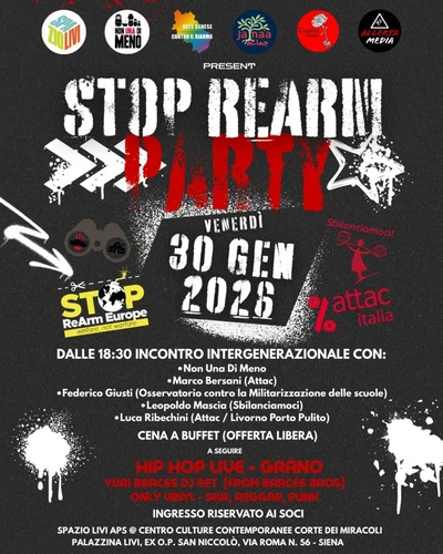 Osservatorio contro militarizzazione di scuole e università - Thursday, February 5, 2026Il 30 gennaio 2026 si è svolta una iniziativa a Siena con attivisti contro la guerra, organizzata da Stop Rearm Europe, Non una di meno, Attac Italia, Sbilanciamoci e Osservatorio contro la militarizzazione delle scuole e dell’università.