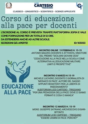 Osservatorio contro militarizzazione di scuole e università - Saturday, February 7, 2026Segnaliamo con piacere questo corso di formazione gratuito organizzato dai Licei “Cartesio” di Triggiano (BA) sotto la coordinazione di Francesco Minervini, docente, attivista e autore di numerosi saggi sul pacifismo, con due promotori dell’Osservatorio contro la militarizzazione delle scuole e delle università.