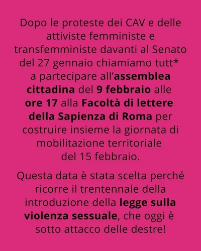 I Centri antiviolenza continuano la mobilitazione permanente contro il ddl bongiorno! Dopo le proteste dei cav e delle attiviste femministe e transfemministe davanti al senato del 27 gennaio chiamiamo tutt* a partecipare alla assemblea cittadina del 9 febbraio alle ore 1730 alla facoltà di lettere della sapienza di Roma per costruire insieme la giornata di mobilitazione territoriale del 15 febbraio. Questa data è stata scelta perché ricorre il trentennale della introduzione della legge sulla violenza sessuale, che oggi è sotto attacco delle destre! Il ddl bongiorno è irricevibile e non è solo una questione tecnico-giuridica ma politica, rappresentando uno strumento di arretramento grave che vuole cancellare anni di lotte per i diritti delle donne riducendole al silenzio e rappresenta lo scudo ostinato di una cultura dello stupro che normalizza la sottomissione delle donne e delle persone lgbtqia+ al dominio maschile patriarcale.