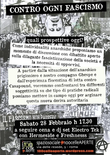 A partire dalla situazione dell’anarchico prigioniero e nostro compagno Ghespe e dall’esperienza fiorentina di lotta contro Casapound, vorremmo confrontarci tra differenti soggettività su che tipo di pratiche radicali possiamo mettere in campo oggi per arginare questa nuova deriva autoritaria.