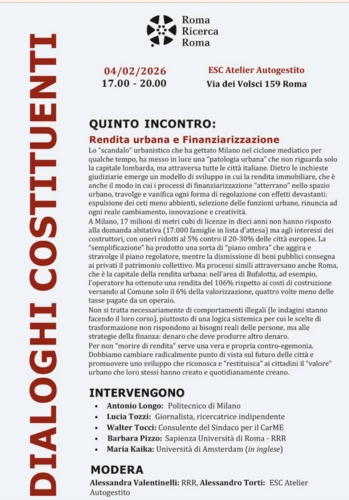 Ospitato da ESC Atelier, uno storico spazio autogestito in via dei Volsci nel popolare quartiere di San Lorenzo a Roma, si è svolto lo scorso 4 febbraio il quinto incontro organizzato da Roma Ricerca Roma sul tema della Rendita urbana e Finanziarizzazione. Un tema decisivo per capire dove sta andando l’urbanistica oggi, come si stanno trasformando le città, quale è il nuovo rapporto tra pianificazione urbana ed investitori privati.