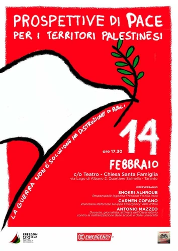 Sabato, 14 febbraio 2026alle ore 17:30 si svolgerà a Taranto presso il Teatro – Chiesa Santa Famiglia, via Lago di Albano, 2 nel Quartiere Salinella l’incontro pubblico aperto alla cittadinanza dal titolo “Prospettive di pace per i territori palestinesi“.