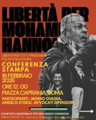 Pressenza - Sunday, February 15, 2026IL Comitato Nazionale per Mohammed Hannoun, segretario dell’Associazione Palestinesi in Italia, arrestato a Genova e detenuto nel carcere di massima sicurezza di Terni, indice una conferenza stampa a ROMA, Piazza Capranica, lunedì 16 febbraio, alle 12.00, alla quale sono invitati gli organi di informazione.