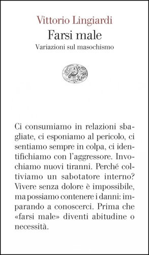 Pulp Magazine - Tuesday, February 17, 2026“Distinguere il dolore / da tutto ciò che dolore non è” (Wislawa Szymborska). Così lo psichiatra e psicoanalista Vittorio Lingiardi anticipa il suo pensiero in Farsi male. Variazioni sul masochismo, dedicando la sua profonda riflessione alle inesorabili consuetudini di danneggiare se stessi e la propria anima. La sua analisi individua l’ombrosa ed equivoca regione del male, ne riconosce la valenza psichica ed emotiva, il giogo dell’umanità alle prese con la volontà dei sentimenti e degli istinti, il carattere e la coscienza delle contraddizioni, la dolorosa e compiacente pulsione autodistruttiva. Accanirsi con forza sulle proprie autopunizioni, logorare la propria realtà nell’incertezza e nell’esitazione di interrompere i rapporti dannosi, le difficoltà soccombenti del disagio, ostacolare il pensiero del proprio benessere, privilegiare crudelmente il peso del soggiogamento e della tirannia in nome della prepotenza delle grandi guide politiche.