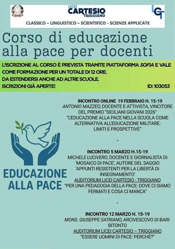 #lascuolavaallaguerra #Bari, Liceo Cartesio, giovedì 19 febbraio ore 15 - Corso di #Educazione alla #Pace per docenti - Incontro con Antonio Mazzeo: "L'educazione alla pace nella scuola come alternativa all'educazione militare. Limiti e prospettive". #istruzione