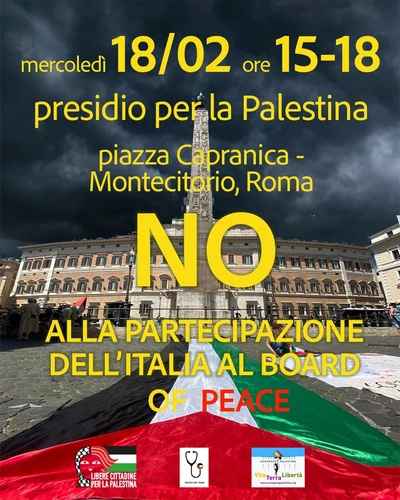 Mercoledì 18 febbraio, dalle 15 alle 18, in Piazza Capranica (Montecitorio), Roma, presidio per dire NO alla partecipazione dell’Italia al Board of Peace.