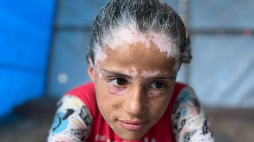 Con i capelli grigi e le macchie bianche sulla pelle, a Lana è stata diagnosticata una vitiligine dopo un grave attacco di panico provocato da un attacco aereo israeliano sul suo quartiere nel gennaio 2024.