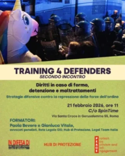 … incontro di formazione a Roma: «Diritti in caso di fermo, detenzione e maltrattamenti». Invito alla formazione per attivisti in manifestazione: Diritti in caso di fermo, detenzione e maltrattamenti – 21 febbraio, Roma Come promesso, ecco l’invito per partecipare al secondo incontro del percorso formativo Training 4 Defenders, su diritti in caso di fermo, detenzione e maltrattamenti, con un focus