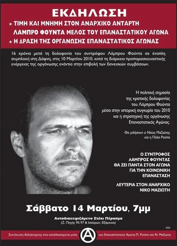 EVENT ANARCHIST GUERRILLA LAMBROS FOUNTAS, MEMBER OF THE REVOLUTIONARY STRUGGLE – THE ACTION OF THE ORGANIZATION REVOLUTIONARY STRUGGLE 16 years after the murder of comrade Lambros Fountas in an armed clash in Daphne, on March 10, 2010, during a preparatory action by the organization against the enforcement of loan agreements. The political significance of the … Continue reading EN/EL/ [POSTER] EVENT: Honor and Memory of the anarchist guerrilla Lambros Fountas, member of the Revolutionary Struggle – The action of the organization E.A. HONOR AND MEMORY TO THE →