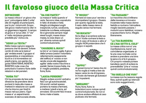 Non essere sessista, autoritario e molesto. In generale non diventare un accollo per chi ti sta intorno. La critical Mass deve poter essere un luogo spensierato e il più sicuro possibile per chi la attraversa.