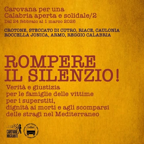 Progetto Melting Pot Europa - Sunday, February 22, 2026Dal 24 al 28 febbraio torna per il secondo anno la Carovana per una Calabria aperta e solidale, un’iniziativa politica e umana che intreccia memoria, denuncia e mobilitazione. Crotone, Cutro, Riace, Caulonia e Reggio Calabria saranno le tappe di un viaggio organizzato da Carovane Migranti e Caravana Abriendo Fronteras 1, che si intreccia con una parte delle iniziative organizzate a Steccato di Cutro e Crotone dalla Rete 26 Febbraio nei giorni del terzo anniversario della strage di Cutro.