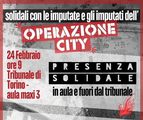Radio Blackout - Info - Monday, February 23, 2026Martedì 24 febbraio h9 le compagne e i compagni imputati nell’operazione City hanno chiamato una presenza solidale dentro e fuori il Tribunale di Torino, in occasione di una delle ultime udienze dell’istruttoria dibattimentale del processo che vede oltre 70 persone imputate per il corteo del 4 marzo 2023.