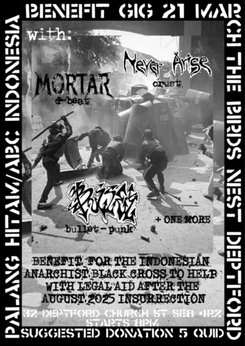 Act for freedom now! - Tuesday, February 24, 2026 Solidarity benefit gig for The Indonesian Anarchist Black Cross Palang Hitam,to help with legal aid after the August 2025 insurrection . 21 March The Birds Nest, 32 Deptford Church Street, SE8 4RZ Start 8PM suggested donation 5 quid . This text words is the back of the flyer for the solidarity benefit Concert gig … Continue reading Solidarity Benefit gig 21 March for the Indonesian Anarchist Black Cross Palang Hitam. (South-London, UK) →