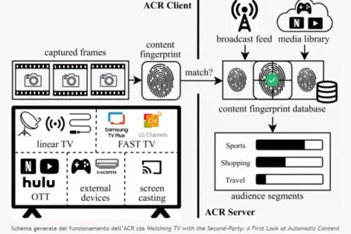 Uno di questi dispositivi è il televisore, o meglio la "Smart TV", come va di moda chiamarla adesso. Sì, perché buona parte dei televisori moderni in commercio è dotata di un sistema che raccoglie informazioni su quello che guardiamo sullo schermo e le trasmette a un archivio centralizzato. Non a scopo di sorveglianza totalitaria, ma per mandarci pubblicità sempre più mirate, basate sulle nostre abitudini e i nostri gusti. In sostanza, molti televisori fanno continui screenshot di quello che state guardando, non importa se sia una serie di Netflix, un videogioco o un vostro video personale, e li usano per riconoscere cosa state guardando e per suggerire ai pubblicitari quali prodotti o servizi mostrarvi.