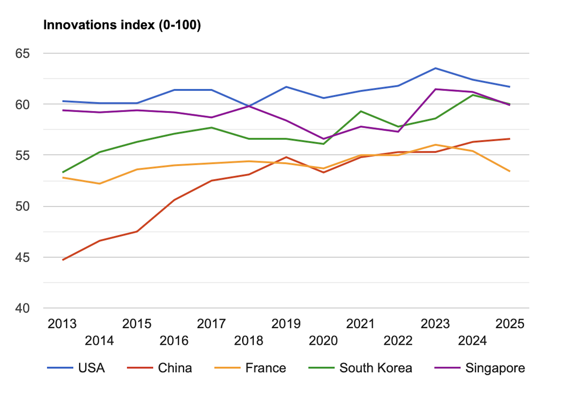 Global Innovation Index (2013-2025) – confronto internazionale. Fonte: TheGlobalEconomy.com (Global Innovation Index, WIPO).Al di là delle decisioni dell’amministrazione Trump, le cause sono strutturali: continuità e livello di investimenti pubblici, capacità di formare e trattenere i talenti, coerenza delle priorità scientifiche e enfasi posta sulla ricerca fondamentale. Mentre la Cina e diversi paesi asiatici hanno integrato la scienza nelle strategie nazionali a lungo termine, gli Stati Uniti hanno permesso che incoerenze e squilibri si accumulassero, facendo affidamento sui guadagni della loro passata attrattività. Ciononostante, mantengono università di eccezionale prestigio, significative capacità di finanziamento e innovazione e un potere di attrazione ancora ampiamente dominante.