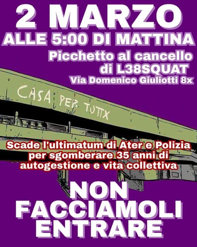 Il lunedì 2 marzo, alle 5:00 di mattina, ci sarà un picchetto al cancello di L38Squat, a Via Domenico Giuliotti 8x, per difendere l'occupazione di fronte all'ultimatum di Ater e Polizia per sgomberare 35 anni di autogestione e vita collettiva.