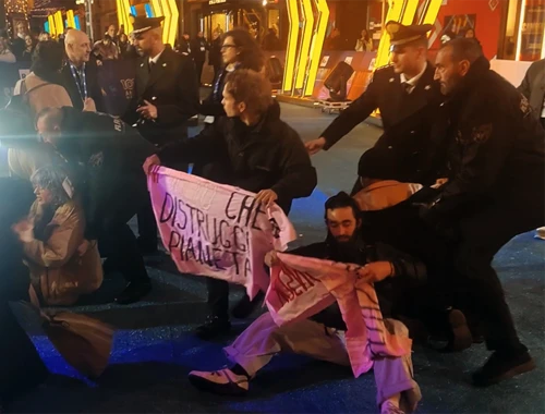 Extinction Rebellion in azione a Sanremo ieri sera, quando un gruppo di persone ha saltato le transenne del Green Carpet, per denunciare le politiche ecocide e operazioni di greenwashing dei principali sponsor: ENI e Costa Crociere, a un passo dall’Ariston. Poi l’arrivo della polizia, che ha violentemente strattonato le persone presenti, poste in stato di fermo…dentro il box pubblicitario di ENI prima del trasferimento in Questura, con rilascio solo all’alba.
