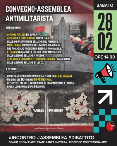 Radio Blackout - Thursday, February 26, 2026Sabato 28 febbraio alle ore 14 si svolgerà a Novara un convegno-assemblea dal titolo Mappare, denunciare e organizzare la resistenza alle fabbriche di guerra organizzato dalla Rete Antimilitarista piemontese e dai comitati locali.