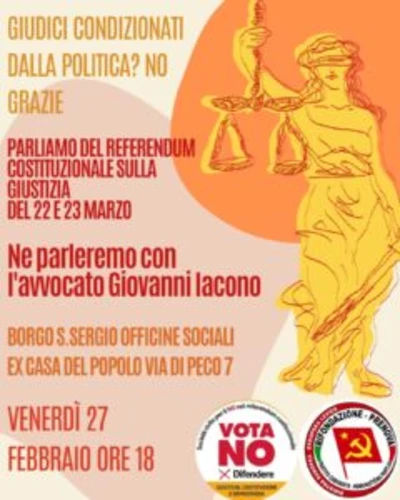 Pressenza - Friday, February 27, 2026Il Partito della Rifondazione Comunista (Trieste), insieme al gruppo “Società civile per il NO al referendum costituzionale”, invita all’incontro “Giudici condizionati dalla politica? No, grazie” che si terrà venerdì 27 febbraio alle ore 18.00 presso la Officine sociali di Borgo San Sergio (ex Casa del popolo), via di Peco, 7. L’incontro sarà preceduto, mercoledì 25 febbraio dalle 10.00 alle 12.00 in Piazza XXV aprile (Borgo San Sergio) da un volantinaggio informativo.
