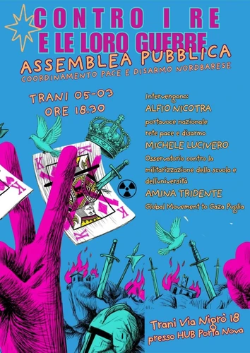 Osservatorio contro militarizzazione di scuole e università - Sunday, March 1, 2026Giovedì 5 marzo, assemblea pubblica del Coordinamento Pace e Disarmo Nord Barese alle ore 18.30 presso HUB Porta Nova a Trani.