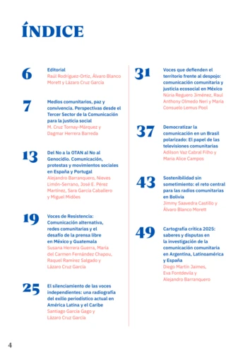 La trayectoria editorial de este sexto informe 2025, construido capítulo a capítulo de manera intercontinental, revela el esfuerzo de investigadoras e investigadores de distintos países de Iberoamérica ―España, Portugal y Latinoamérica―que analizan y reflexionan sobre la evolución de los medios y experiencias de comunicación alternativa y comunitaria. Estos son agentes fundamentales para la democracia, la diversificación del ecosistema informativo, la elaboración de narrativas de paz, y la promoción del diálogo y la inclusión social.