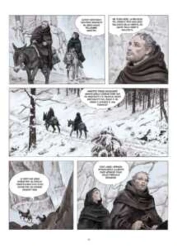 La costruzione della tavola rivela poi un controllo rigoroso del ritmo. La gabbia non è sperimentale né frantumata, ma solida, leggibile, funzionale alla chiarezza narrativa. Soprattutto col secondo volume, Manara evita soluzioni barocche e privilegia una scansione che alterna stabilità e dinamismo, sostituendo la densità verbale del romanzo con una gestione spaziale del racconto. Manara non cede neppure all’iconografia da horror monastico o all’estetica gotica cinematografica, sedimentata principalmente dalla versione cinematografica di Jean-Jacques Annaud del 1986. Niente eccessi di ombre espressioniste o vertigini architettoniche esasperate, ma un monastero imponente e misterioso, una biblioteca che è un dispositivo razionale e geometrico. Il mistero non nasce dall’oscurità spettacolare, bensì dalla disposizione dello spazio, dalla tensione intellettuale e dall’enigma cognitivo. Il Medioevo viene mostrato come campo di tensioni culturali, di dispute dottrinali, di conflitti simbolici. L’inquietudine proviene dall’idea che il sapere può essere manipolato o proibito dall’uomo, non dal soprannaturale.
