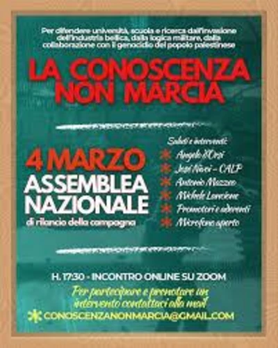 La campagna “la conoscenza non marcia” è una iniziativa che unisce una rete di realtà organizzate del mondo della scuola e dell’università, che ha l’obiettivo di darsi uno strumento per interrompere i rapporti tra l’istruzione pubblica e il complesso militare-industriale.