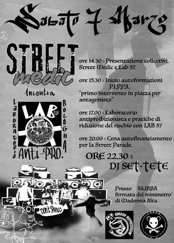 Riduzione del rischio e street medic: incontro con scambio pratiche, confronto su contesti e possibili interazioni. A seguire autofinanziamento street parade.