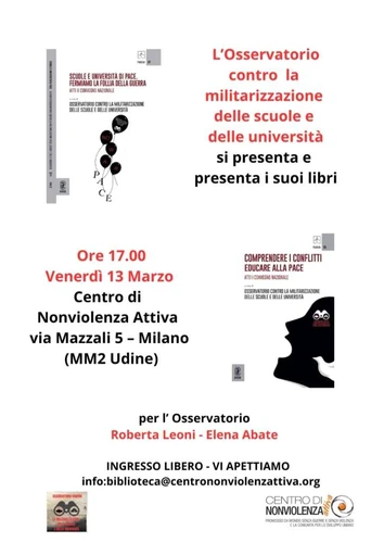 Venerdì 13 marzo alle ore 17.00 il Centro di Nonviolenza Attiva in via Mazzali n. 5 MM Udine (MI) ospita la presentazione dei volumi di recente pubblicazione “Scuole e Università di pace. Fermiamo la follia della guerra” (Aracne, 2026) e “Comprendere i Conflitti Educare alla pace” (Aracne, 2025).