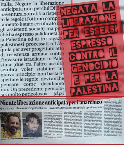 Soccorso Rosso Proletario - Wednesday, March 4, 2026Gigi, compagno anarchico agli arresti domiciliari per aver difeso un corteo no snam dalla violenza poliziesca, si è visto negare la liberazione anticipata perché solidale con la Palestina e i prigionieri politici palestinesi. Il magistrato di sorveglianza ha motivato questa … Continua a leggere→