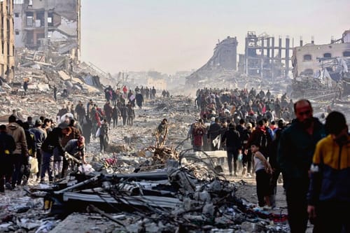 Palestinesi sfollati tra le rovine di Jabaliya, Striscia di Gaza, 19 gennaio 2025. Omar Al-Qattaa/AFP)
