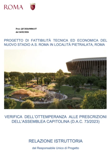 (1) Decisione di Giunta (da sottoporre all’approvazione dell’Assemblea Capitolina) 24aProposta (D.G.C. n. 15 del 26 febbraio 2026) Progetto di Fattibilità Tecnica ed Economica (PFTE) e documenti allegati del Nuovo Stadio di calcio in Roma, località Pietralata. Presa d’atto della verifica dell’ottemperanza del PFTE alle condizioni, prescrizioni e raccomandazioni espresse con Deliberazione dell’Assemblea Capitolina n. 73/2023. Autorizzazione al rappresentante di Roma Capitale, nella persona del Sindaco o suo delegato, a partecipare alla Conferenza di Servizi decisoria ai sensi dell’art 4 del D.Lgs. n. 38/2021 Scarica la decisione di giunta/proposta di delibera