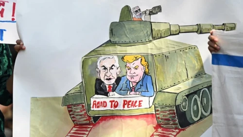 Invictapalestina - Friday, March 6, 2026Se Netanyahu riuscirà a schiacciare la Repubblica Islamica, la sua visione espansionistica violenta si rivolgerà poi agli Stati arabi del Golfo Fonte: English version Immagine di copertina: Un manifestante contro la guerra a Nuova Delhi tiene in mano un cartello raffigurante il presidente degli Stati Uniti Donald Trump e il primo ministro israeliano Benjamin Netanyahu, …