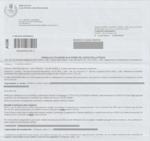 17 sanzioni comminate dalla Polizia di Roma Capitale per altrettanti manifesti realizzati e affissi da ignoti, per un totale che ha raggiunto i 15000 euro, pendono sull’associazione, ma possono costituire un inquietante precedente che incombe sull’impegno dei cittadini attivi della Capitale