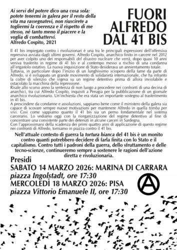 La Nemesi - Thursday, March 5, 2026Fuori Alfredo dal 41 bis. Iniziative a Carrara e a Pisa, 14 e 18 marzo 2026 Fuori Alfredo dal 41 bisIniziative a Carrara e a Pisa, 14 e 18 marzo…