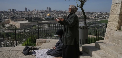 A causa della guerra di aggressione contro l'Iran, Israele ha isolato la Città Vecchia di Gerusalemme. Invece che nella moschea di Al-Aqsa, queste donne recitano la preghiera del mezzogiorno del terzo venerdì del Ramadan sul Monte degli Ulivi.