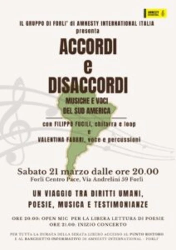 Pressenza - Tuesday, March 10, 2026Il 21 marzo, primo giorno di primavera, Giornata Mondiale della Poesia e Giornata nazionale della memoria e dell’impegno in ricordo delle vittime innocenti delle mafie, il gruppo locale di Amnesty International propone a Forlì una serata dedicata all’incontro tra arte e diritti umani.