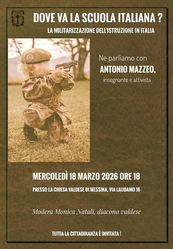 #lascuolavaallaguerra #Messina, Chiesa Valdese, mercoledì 18 marzo, ore 18 - Dove va la #scuola italiana? La #militarizzazione dell'istruzione in Italia. Con Antonio Mazzeo, insegnante e attivista. Modera Monica Natali, diacona valdese.