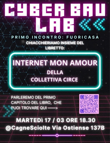 Cagne Sciolte - Thursday, March 12, 2026Martedì 17 marzo 2026 ore 18.30 – Prima iniziativa del laboratorio CyberBau: “Fuoricasa”.Discussione a partire dal libretto “Internet mon amour”, della collettiva CIRCE. Parliamo di reti: tecnologie di relazione, comunicazione, informazione. Come funziona Internet? Come abitarla in maniera femminista, sabotando … Continue reading →