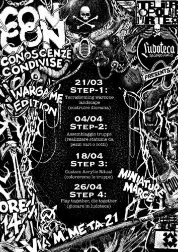 LABPUZZLE – Bene Comune - Friday, March 13, 2026Di tutti gli interessi, quello dei wargame è sempre sembrato il più economicamente esclusivo.Ma è davvero così? SÍ! È COSÌ!Ma niente paura! Con questo ciclo di workshop esploreremo insieme tante valide alternative accessibili e sostenibili per coltivare questo hobby, senza spendere milioni di euro in miniature e materiali. Il workshop sarà diviso in quattro incontri: […]