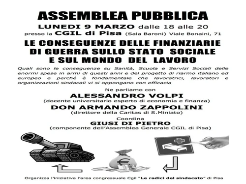 Osservatorio contro militarizzazione di scuole e università - Saturday, March 14, 2026L’Osservatorio contro la militarizzazione delle scuole e delle università è stato inviato all’assemblea promossa dall’area di minoranza della Cgil e abbiamo accolto, come nodo pisano, l’occasione per coinvolgere lavoratori e lavoratrici nel percorso di resistenza alla guerra e di aperto contrasto alla militarizzazione delle scuole e dell’università.