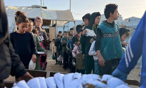 Distribuzione di cibo (febbraio 2026) promossa dalla cucina popolare ad Al-Mawasi, Striscia di Gaza, progetto SOS Gaza