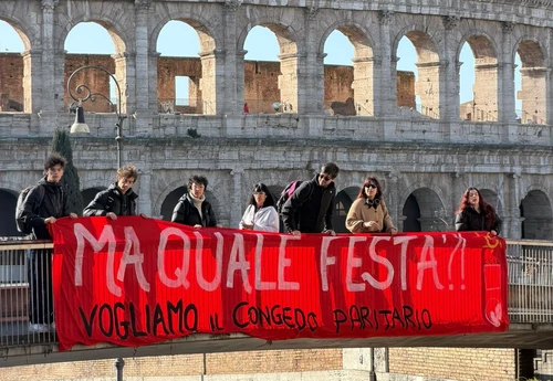 Questa mattina, giovedì 19 marzo, CGIL, Rete degli Studenti Medi e Unione degli Universitari (UDU) hanno srotolato uno striscione davanti al Colosseo a Roma per chiedere l’introduzione di un congedo di paternità paritario e pienamente retribuito e denunciare la recente bocciatura della proposta che avrebbe introdotto una riforma strutturale dei congedi parentali.