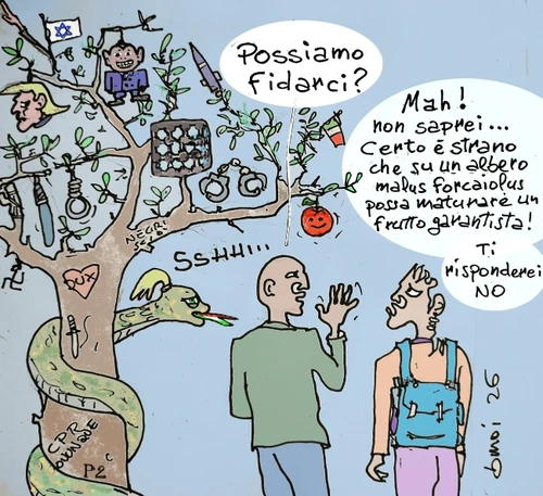… dal Vangelo secondo Matteo 7,16 di Benigno Moi Assodato che le vignette non vanno spiegate… ma sono un sasso buttato come spunto di riflessione, per ogni vignetta almeno un link (forse) Lei voleva darci la mela… * * Chiedo venia se il titolo di questa Furundulla rimane ostico ai più. Solo chi conosce uno sketch (famoso da noi in