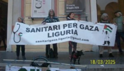 … e il 18 marzo 2026 i promotori dell’iniziativa svolta ogni mercoledì pomeriggio, dalle 18 alle 19, in piazza Ferrari, sulla gradinata di Palazzo Ducale, un edificio storico cittadino dove vengono allestite mostre d’arte e rassegne e tenuti eventi culturali, in cui ha sede la Fondazione per la Cultura e sulla cui facciata è esposto lo striscione R1PUD1A, hanno dedicato la 1242ª ora contro la guerra in solidarietà con la Rete Sanitari per Gaza e con il collettivo Ferrovieri Contro la Guerra, contemporaneamente mobilitato alla stazione ferroviaria ‘Centrale’ di La Spezia e di cui hanno diffuso il comunicato: