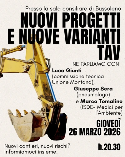 notav.info - Tuesday, March 24, 2026Dopodomani, giovedì 26 marzo, si terrà a Bussoleno un incontro pubblico aperto a tutta la popolazione, dedicato ai possibili futuri cantieri TAV previsti nel comune e ai rischi ad essi […]