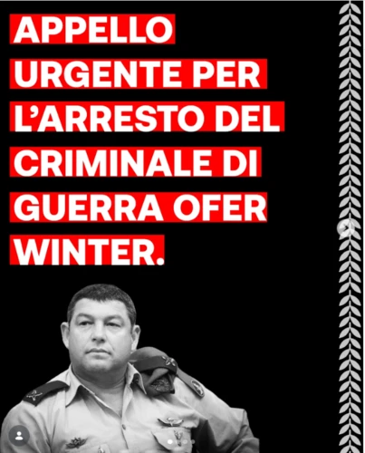 Contropiano - Tuesday, March 24, 2026Insieme ad altre associazioni della società civile abbiamo lanciato un appello per chiedere l’arresto del criminale di guerra Ofer Winter, ex generale dell’esercito israeliano in arrivo in Italia che ha invocato la pulizia etnica della striscia di Gaza e si è distinto già nel 2014 per attacchi e bombardamenti deliberati […]