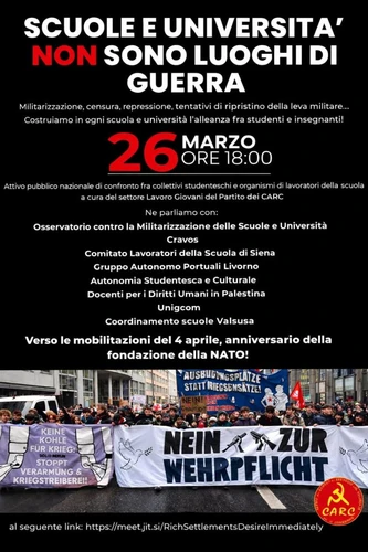 Proprio per alimentare la convergenza fra studenti e insegnanti – i protagonisti della scuola pubblica, quelli che la vivono ogni giorno e che sono in grado di indicare le misure che servono – il settore Lavoro Giovani del P.CARC organizza l’iniziativa pubblica online “Scuole e università non sono luoghi di guerra”, un confronto pubblico sulle prospettive e i metodi di lotta e di convergenza da adottare per rifondare dal basso un vero diritto allo studio.