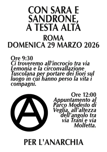 * Come Compagni e Compagne che ti hanno conosciuta molti anni fa e con te hanno attraversato percorsi comuni lungo il cammino verso il Comunismo, vogliamo dedicarti alcune parole per rendere giustizia e onore alla persona che eri. Dalle lotte territoriali a quelle degli studenti, dall'organizzazione dei lavoratori alla lotta per il diritto alla casa, ci sei sempre stata, in prima fila, mettendo tutta te stessa nella lotta per una società libera dallo sfruttamento e dall'oppressione. Durante la tua esperienza umbra ti sei progressivamente avvicinata agli ambienti anarchici, animando, con la stessa energia che ti ha sempre contraddistinta, le realtà di cui hai fatto parte, continuando la lotta a fianco degli sfruttati, nel solco di un'idea rivoluzionaria votata all'Anarchia. Nel corso della tua vita hai affrontato molti momenti difficili che ci accomunano tutti: precarietà, bassi salari e disoccupazione. Le difficoltà che hai incontrato ti hanno resa più tenace, forte e determinata e, forse, l'impotenza contro questa società totalizzante - in cui il termine "democrazia" viene svuotato di senso e utilizzato per mascherare le pratiche capitaliste votate allo sfruttamento dell'essere umano sull'essere umano, sull'ambiente e sugli animali - ti ha spinta verso scelte sempre più estreme. Sposiamo il tuo spirito combattivo allo stesso modo con cui rivendichiamo le prospettive rivoluzionarie enunciate nel tuo, ormai famoso, intervento in aula di tribunale: siamo nemici dello Stato, delle sue leggi e delle sue istituzioni; lottiamo per una società libera dallo sfruttamento e dall'oppressione della classe proletaria, per un'esistenza di eguaglianza tra tutti gli uomini e tutte le donne. In questi giorni, i giornali italiani si affrettano a descrivere la tua vita e le tue gesta politiche cercando di criminalizzarti, trasformandoti in un mostro assassino, una spietata terrorista. Ma sono ben lontani dalla verità. Conosciamo l'odio che anima quei vili pennivendoli prezzolati con cui ogni giorno viene falsificata la realtà, trasformando il carnefice in vittima e la vittima in carnefice. Siamo coscienti del tentativo di criminalizzare le lotte condotte dai Compagni anarchici come di chiunque abbia il coraggio e la volontà di alzare la testa per combattere questa società capitalista e infame. Oggi ricordiamo con rabbia e dolore la nostra Compagna Sara. Eri una ragazza giovane, sorridente, generosa, altruista, disponibile ad ascoltare e a sostenere chiunque nei momenti di difficoltà. Non hai mai lasciato indietro nessuno. Nonostante i diversi percorsi che abbiamo intrapreso sarai per sempre nostra Compagna, nostra amica, nostra sorella. Continuerai a vivere nelle nostre lotte per una società altra e libera.